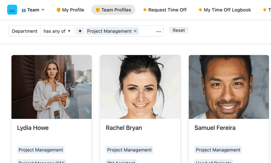 • by team member: displays team member photo, perfect for quickly understanding who’s who within the existing company structure